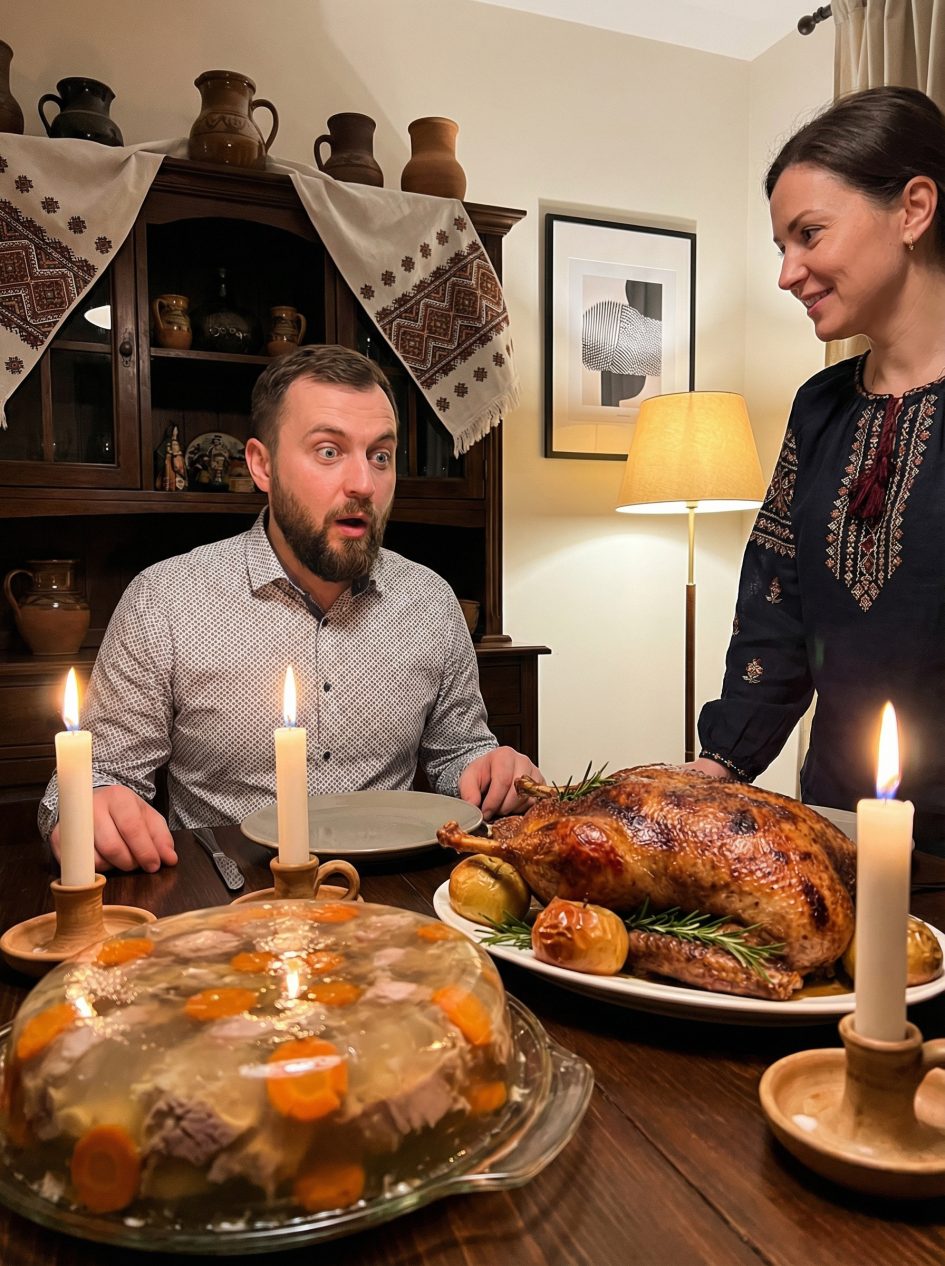 А я розносила страви. Холодець, змішала бульйон із м’ясом, він застиг ідеально… Качка на великій овальній тарілці, рум’яна, запашна, з ранку томилася в духовці, аж стікала соком… «Олів’є» — я його робила завжди добре, просто раніше мовчала. Виклала гіркою в салатниці, прикрасила креветками й перепелиними яйцями… Салат «Мімоза» шарами…