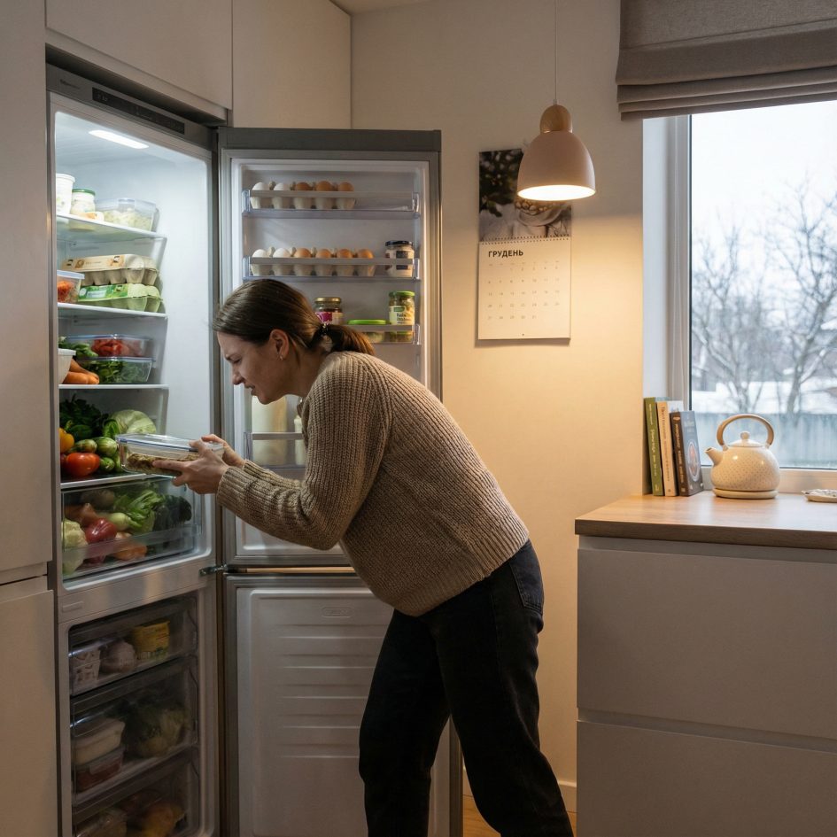 Марина стояла перед відкритим холодильником і намагалася втиснути контейнери з холодцем між лотками з яйцями та горою овочів. Спина нила, пальці пахли часником, а у скронях стукало так сильно, що аж темніло в очах. До нового року залишалося два дні, але святкового настрою не було й близько.