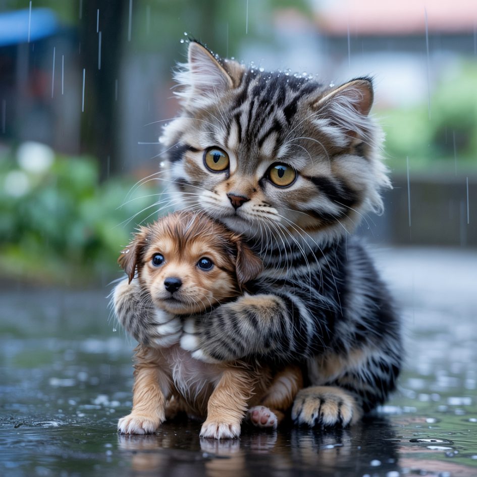 У вузькому просторі між будинками вона побачила їх: кішка сіра, статна, і маленьке тремтяче щеня, що притулилося до неї. Кішка час від часу лизала малюка та озирнулась на людей.