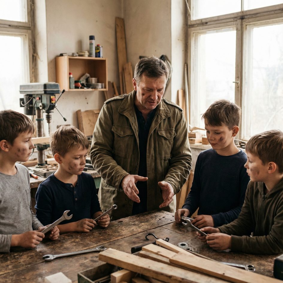 Там стояли верстати, висіли інструменти, а за одним зі столів сидів Валерій в оточенні хлопчаків різного віку. Він їм щось показував, розбираючи якусь деталь, і діти слухали його, відкривши роти.