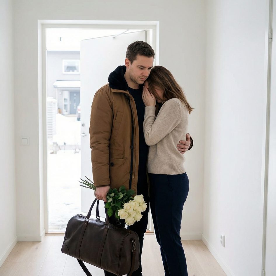 Дмитро нетерпляче відчинив двері і зайшов до квартири, однією рукою тримаючи свою величезну дорожню сумку, а іншою – букет білих троянд. Як тільки він переступив поріг, зі спальні радісно вибігла його дружина і, кинулася в обійми чоловіка.