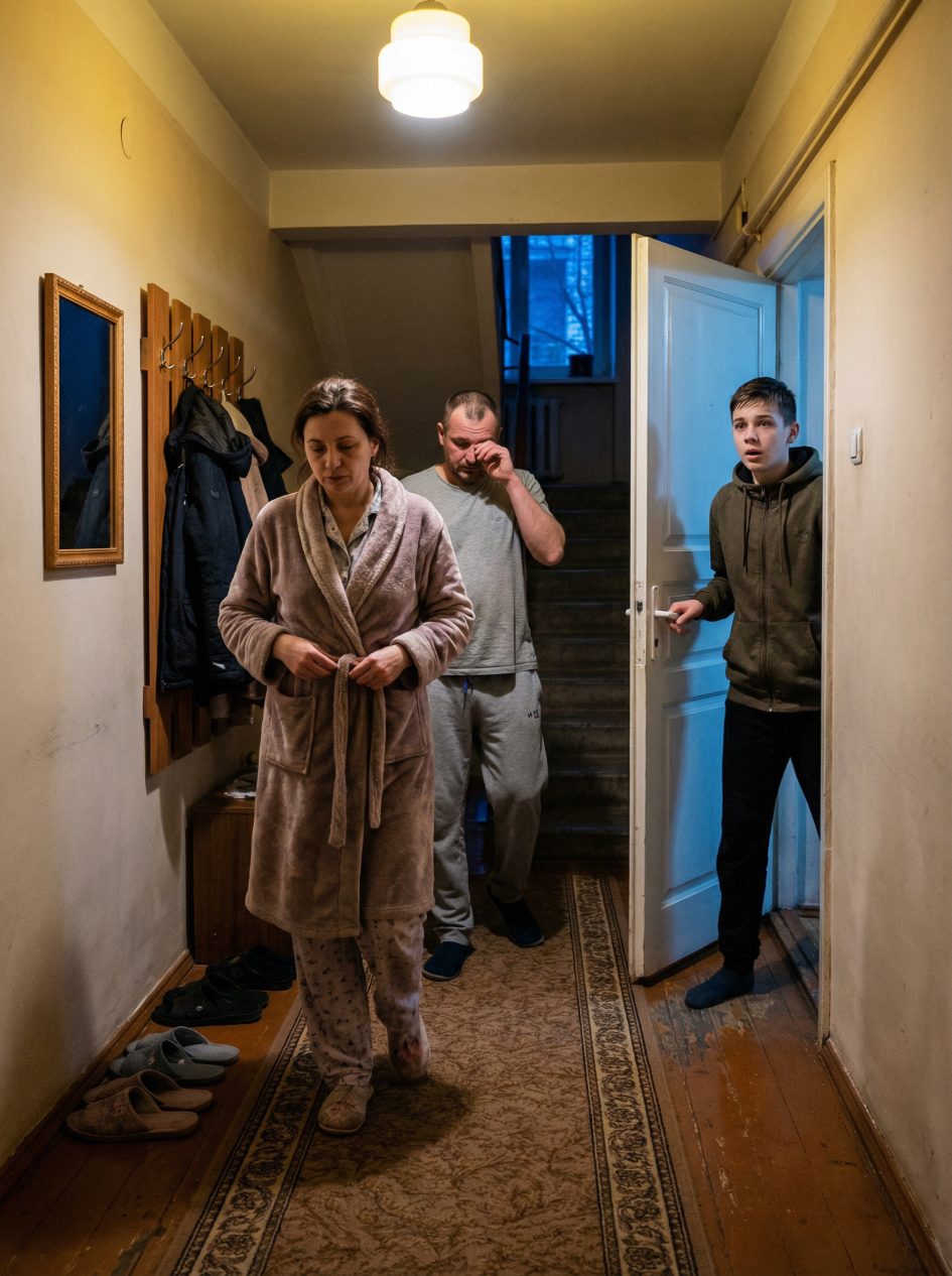 Марина швидко накинула халатик і здивовано пішла відкривати. Степан пішов за нею.