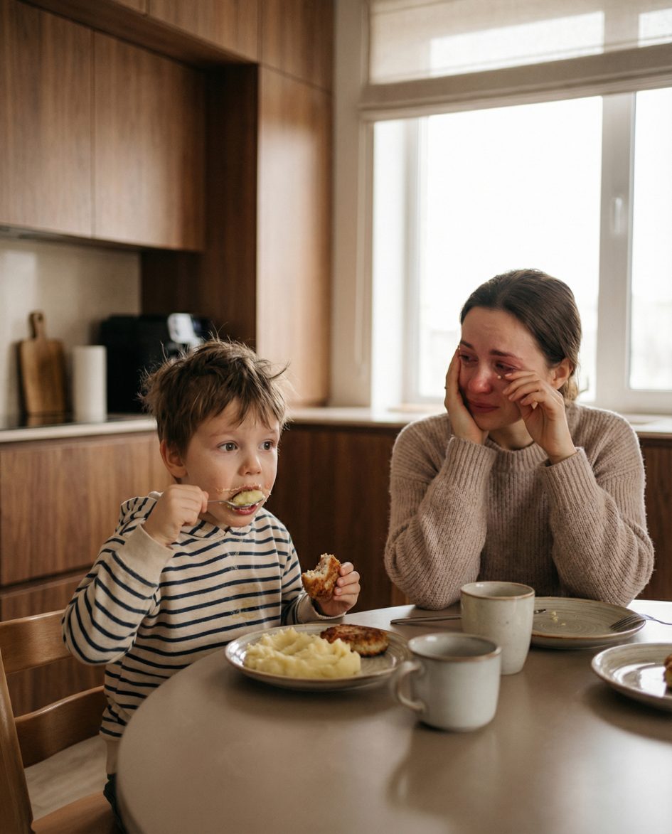 Коли зайшов на кухню на столі на нього чекала картопля пюре і котлета. Дитина жадібно накинулася на їжу, а жінка дивилася на нього витирала сльози: