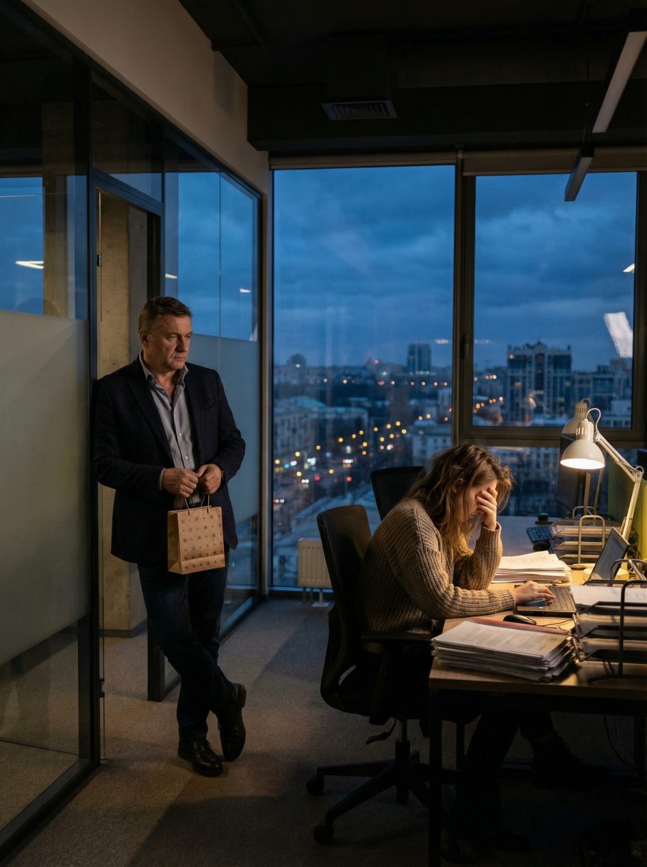 – О, а ти чого це тут одна? А я для дружини подарунок забув, уявляєш? – випалив він і зник у своєму кабінеті.