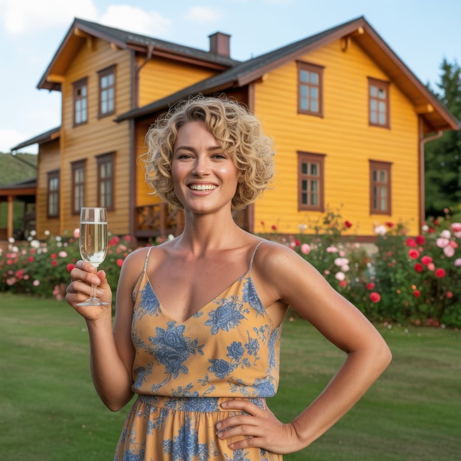 На знімку сестра стояла на ґанку бабусиної дачі з келихом ігристого, широко посміхаючись в об’єктив. Підпис під фото: «Дякую батькам за найкращий подарунок! Тепер у дітей буде свій куточок природи!