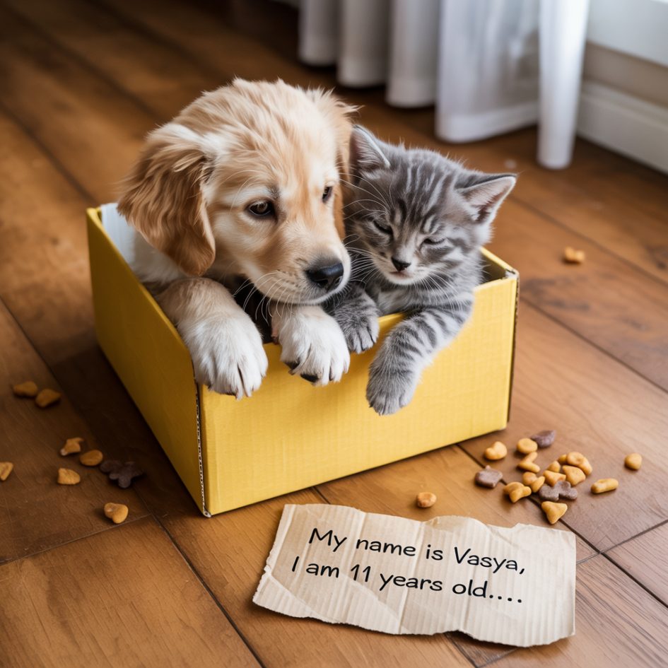 Роздуми обірвав тоненький писк. Під лавкою, серед сміття та опалого листя, щось причаїлося. Або хтось. Два злякані погляди — один жовтий, інший сірий — дивилися на неї. Цуценя і кошеня пригорнулися у старій взуттєвій коробці. Поруч — порожні упаковки корму та дитяча записка: