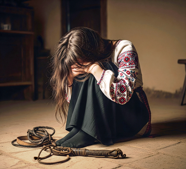 Молодиця згорнувшись клубочком на долівці, захлиналася слізьми, а над нею, мов темна хмара, стояв батько, затиснувши в руці батіг.