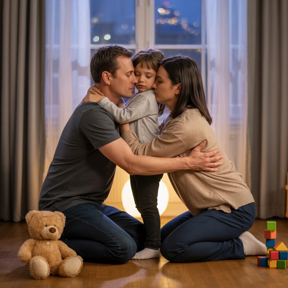 Потім він, не випускаючи дочку з обіймів, обійняв і маму. А Оля обійняла їх обох за шию та заплющила очі. Тому що дорослі цілувалися…