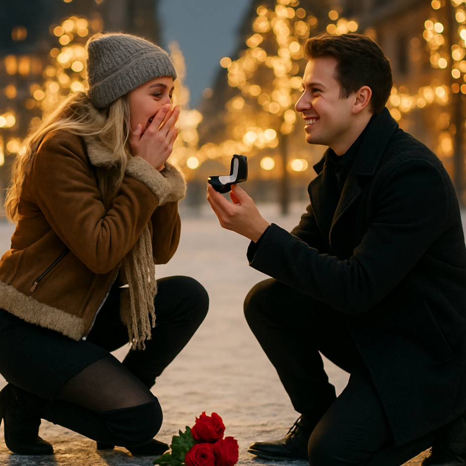 Люда опустила погляд і побачила, що молодик стоїть на підлозі на одному коліні і тримає перед нею коробочку з маленькою, блискучою каблучкою.