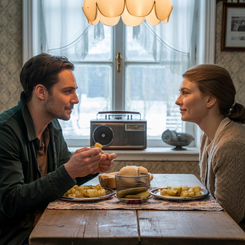 Чоловік прийшов з роботи. Зайшов на кухню і сів за стіл. Дружина поставила на стіл сковорідку зі смаженою картоплею, поруч сало і солоні огірки.