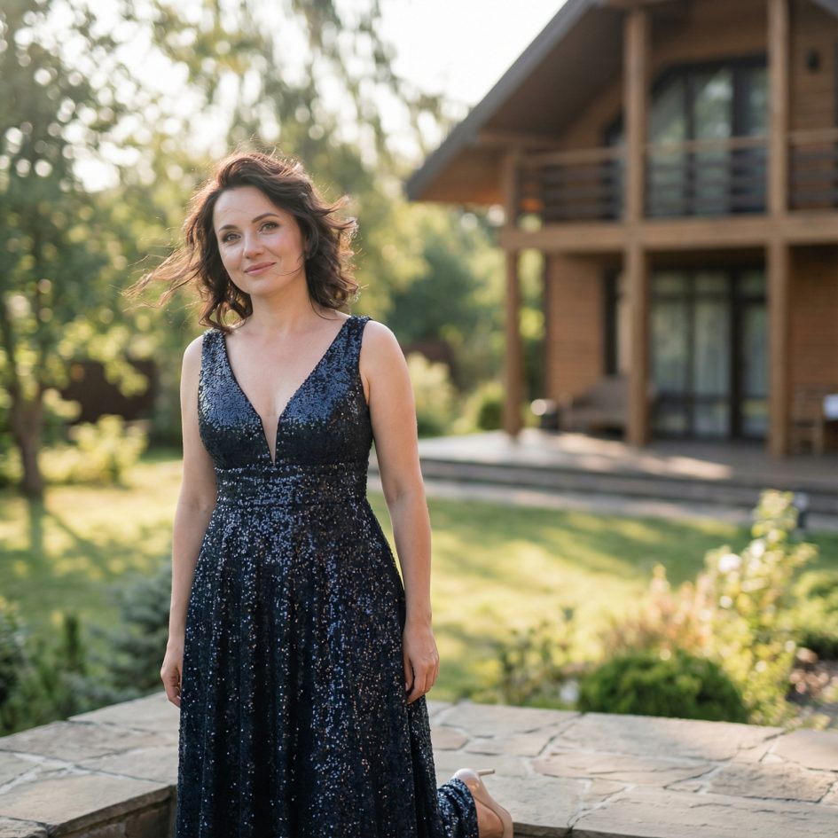 Вона вже вбралася, одягнувши шикарну блискучу сукню з глибоким декольте, зробила гарну зачіску і святковий макіяж. На ноги одягла туфлі на високих підборах.